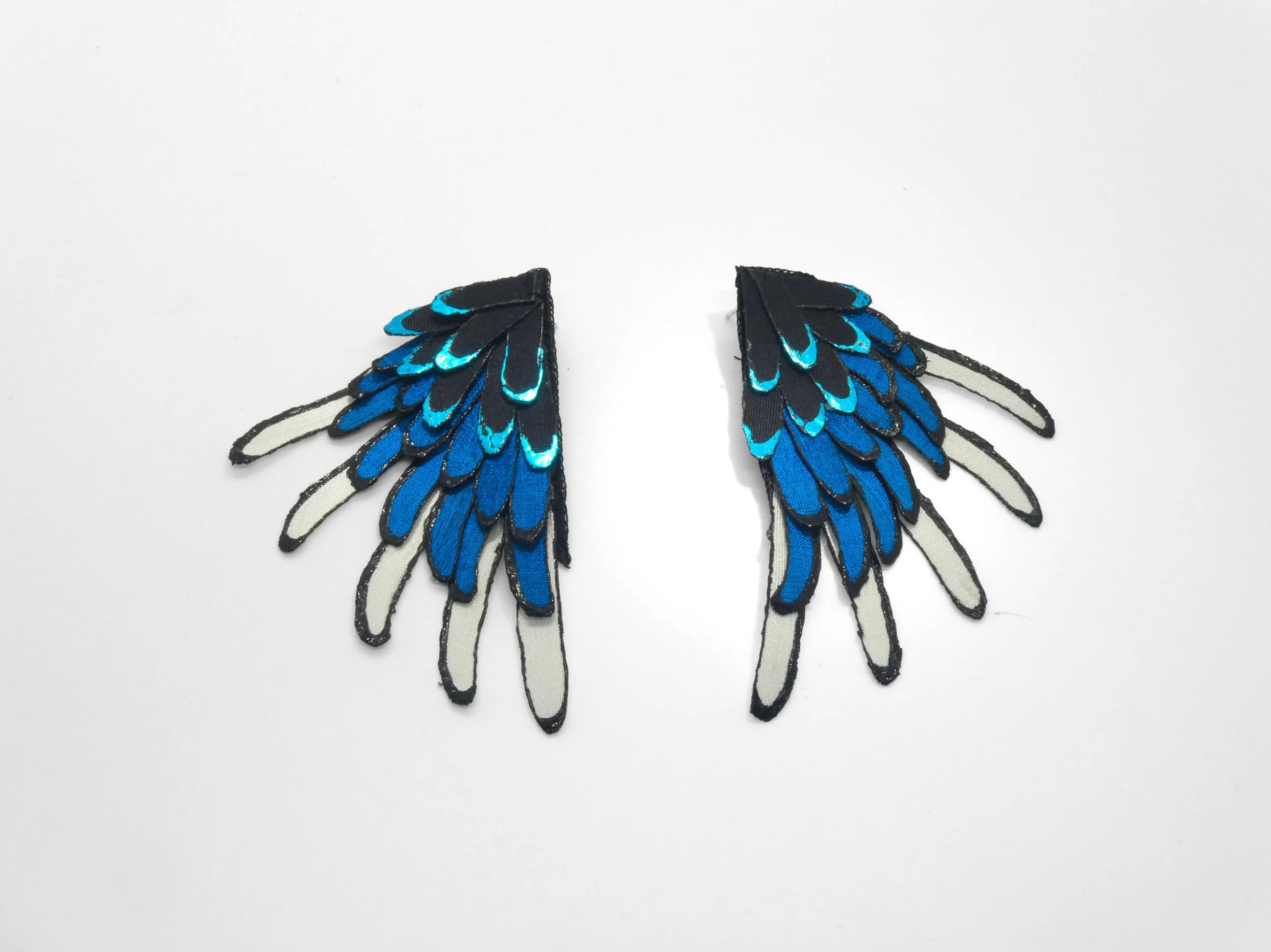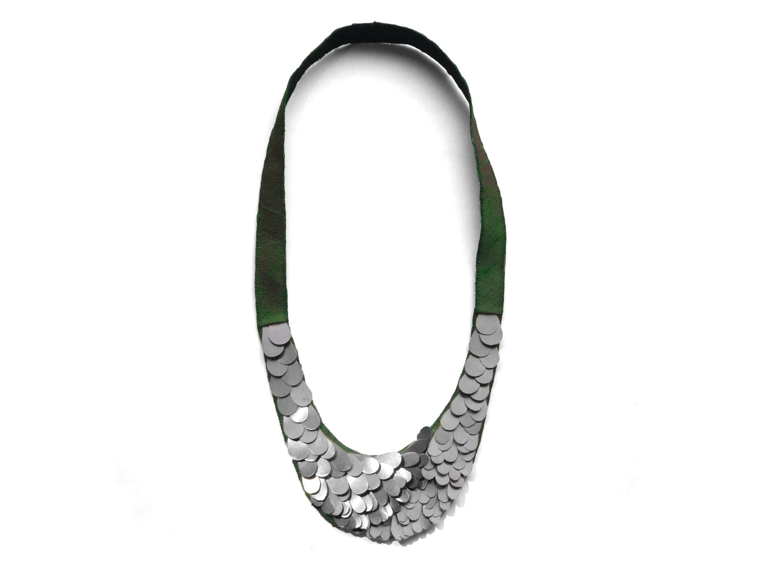 Pica: silk, metallic leaf, acrylic and silver clasp